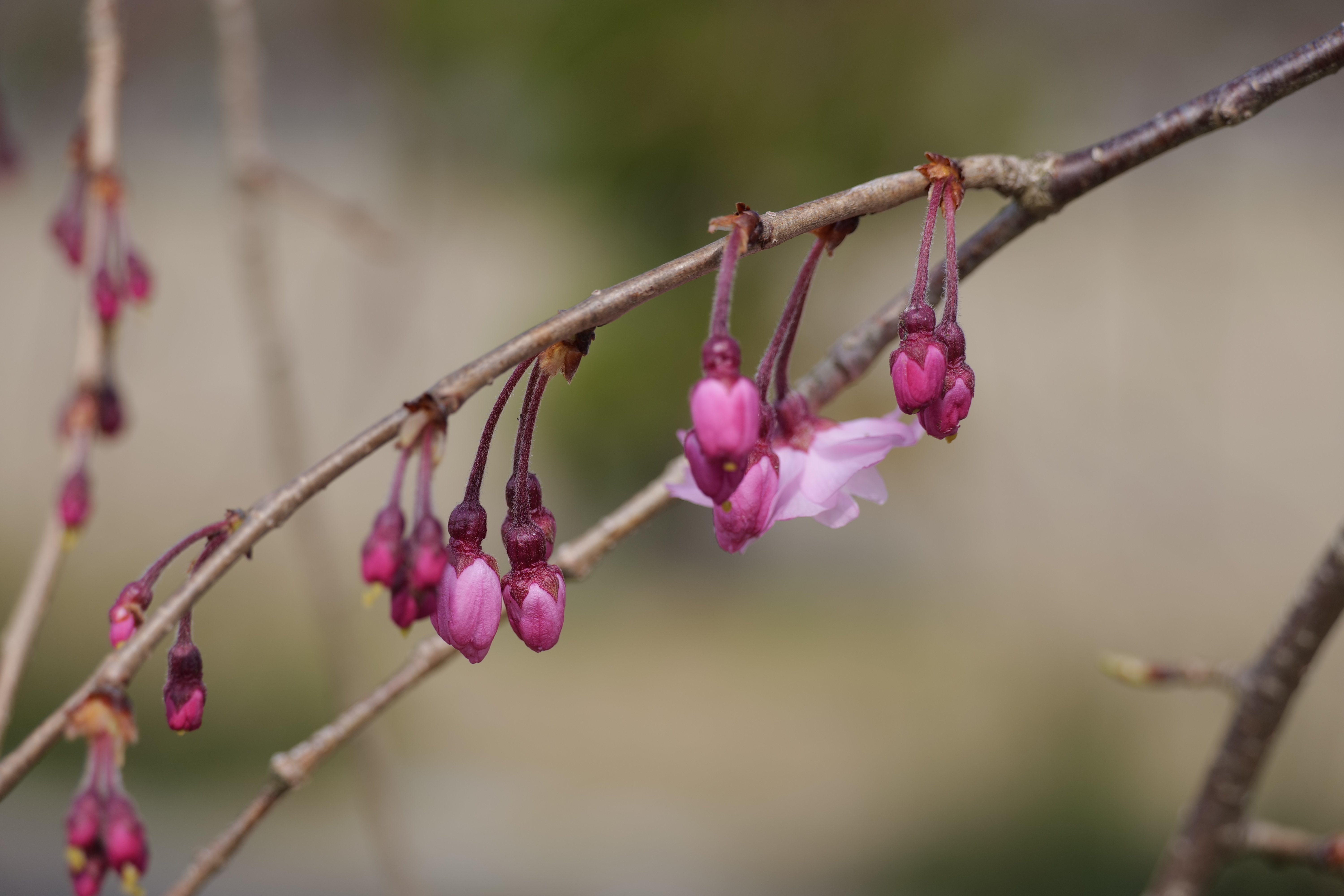 シダレザクラ→数輪咲く。満開は昨年並みで4月半ば